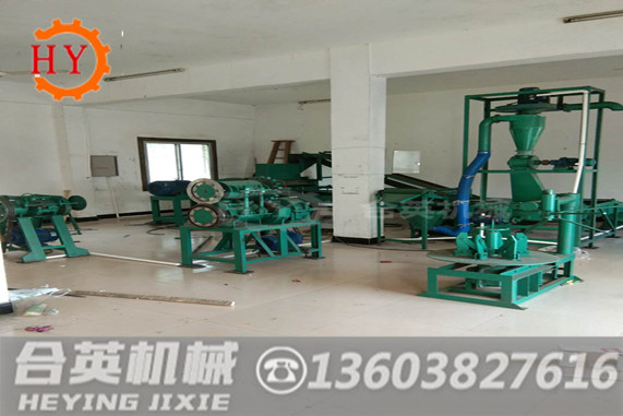 1.(大型高產(chǎn)量鋼絲輪胎粉碎機)廢舊輪胎→ 輪胎切口機→切條機→切塊機→輥筒磨粉機 → 一次磁選機→ 旋風(fēng)除塵上料機→ 篩選機→ 再次磁選→ 成品膠粉檢驗→ 入庫。