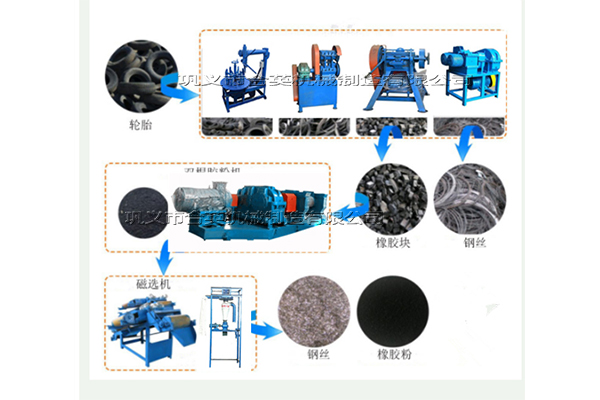 3.高產(chǎn)型輪胎膠粉生產(chǎn)線(xiàn)配置:切圈機;切條機;切塊機;破膠機(磨粉機),輸送帶上料機,磁選機,纖維分離機;
