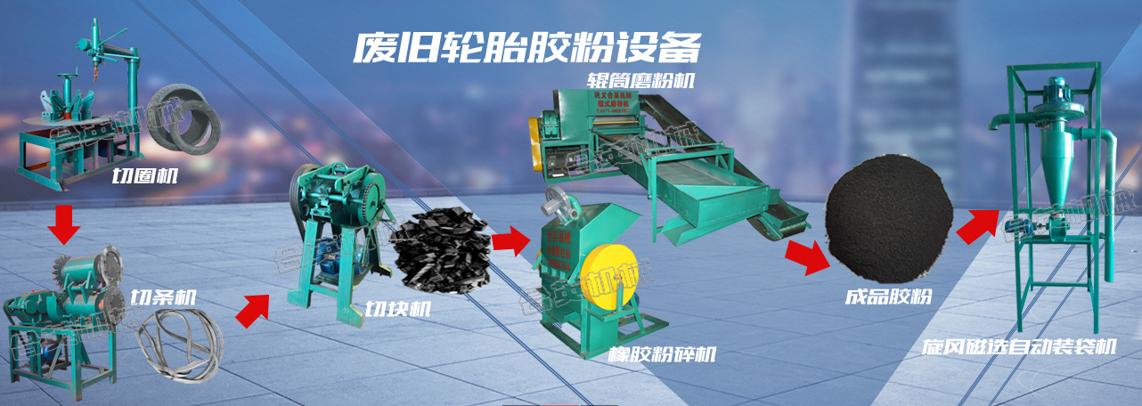 小型廢舊輪胎粉碎機工藝流程:廢舊輪胎→切圈機→切條機→切塊機→破碎機→一次磁選機→研磨機→篩選機→上料機→研磨機→半成品→再次磁選→檢驗→入庫